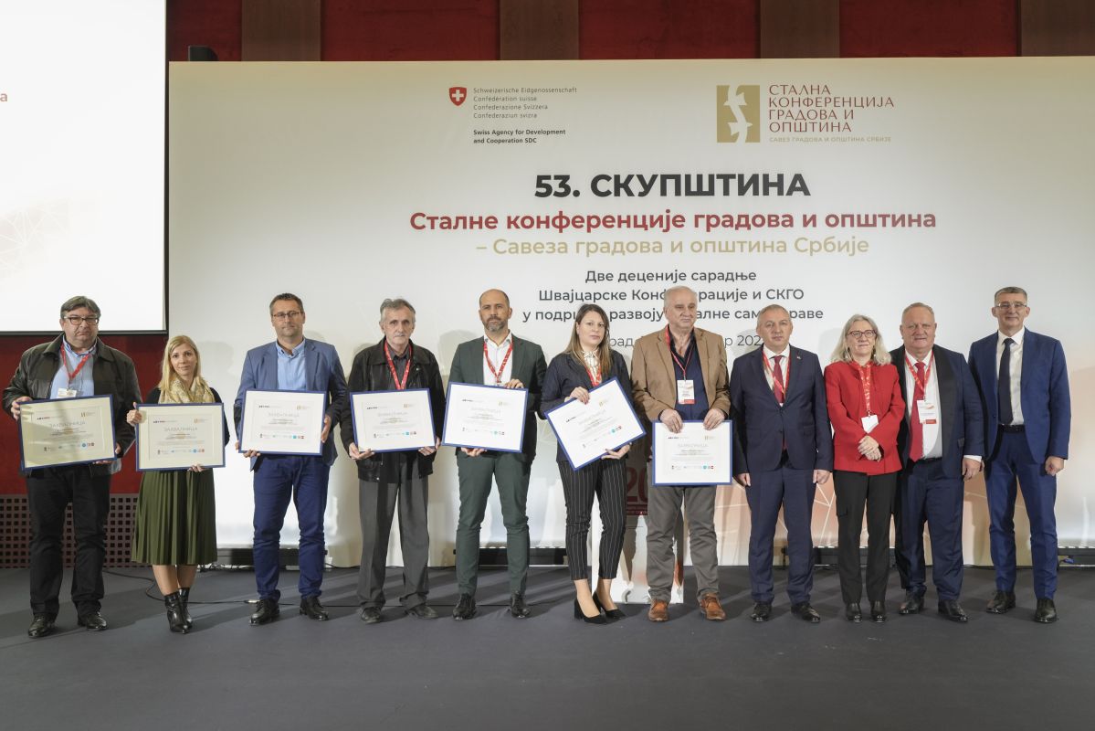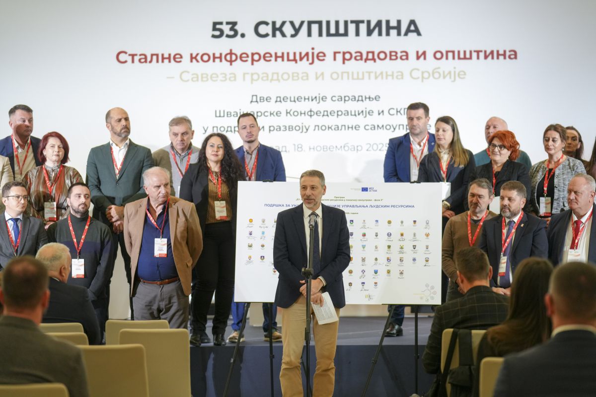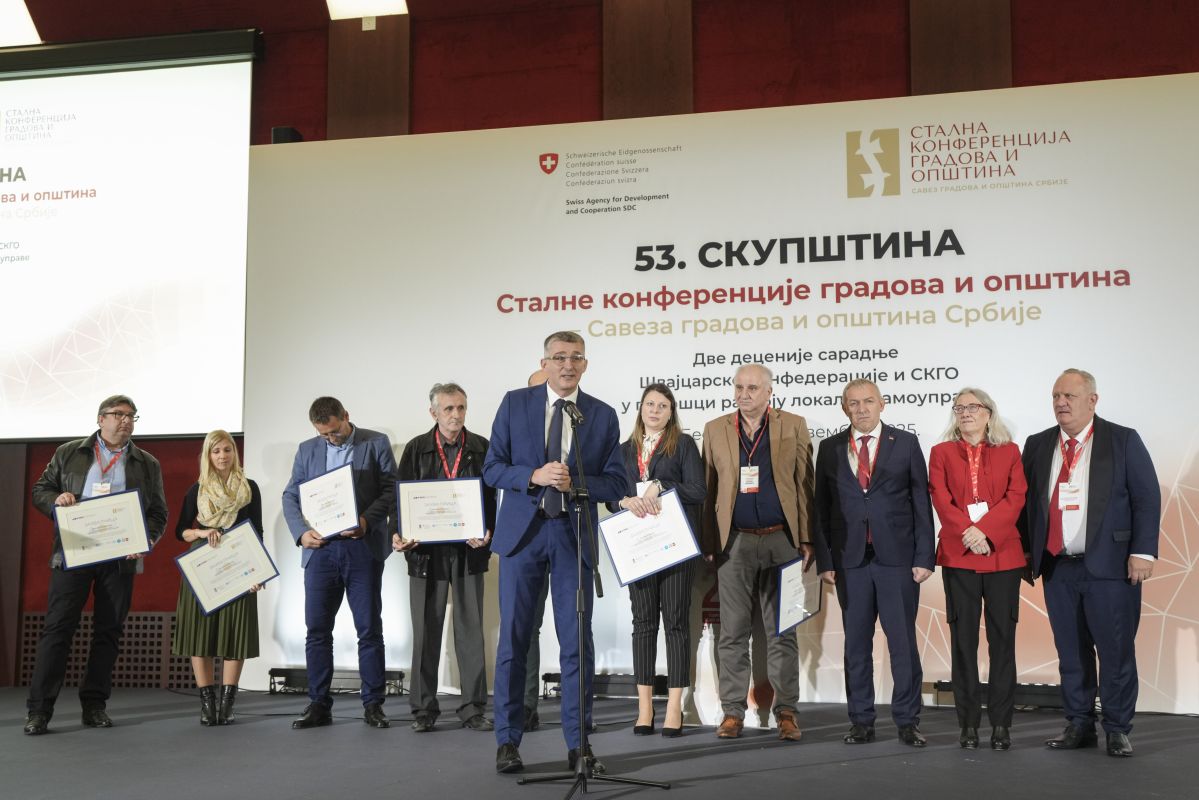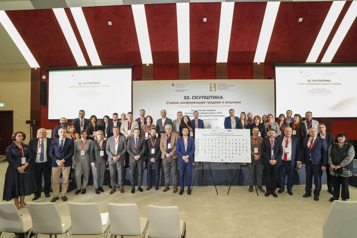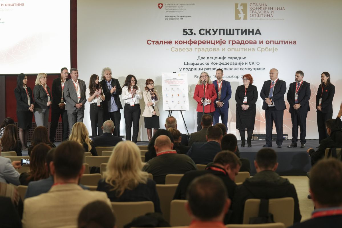 Tokom svečanog dela programa 53. skupštine Stalne konferencije gradova i opština (SKGO), održane 18. novembra 2025. godine u Beogradu, 15 lokalnih samouprava dobilo je zahvalnice za uspešno sprovođenje paketa podrške, dok su u okviru dva projekta sa 89 gradova i opština potpisani sporazumi o sprovođenju novog ciklusa podrške.