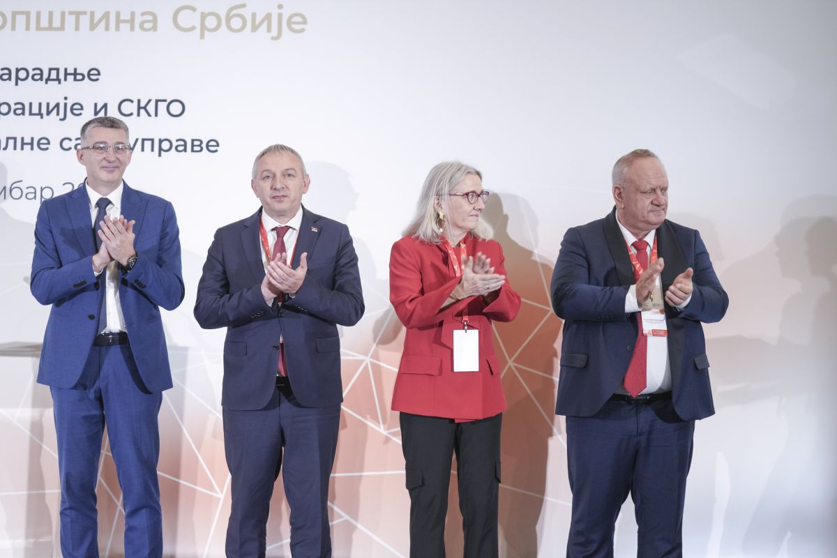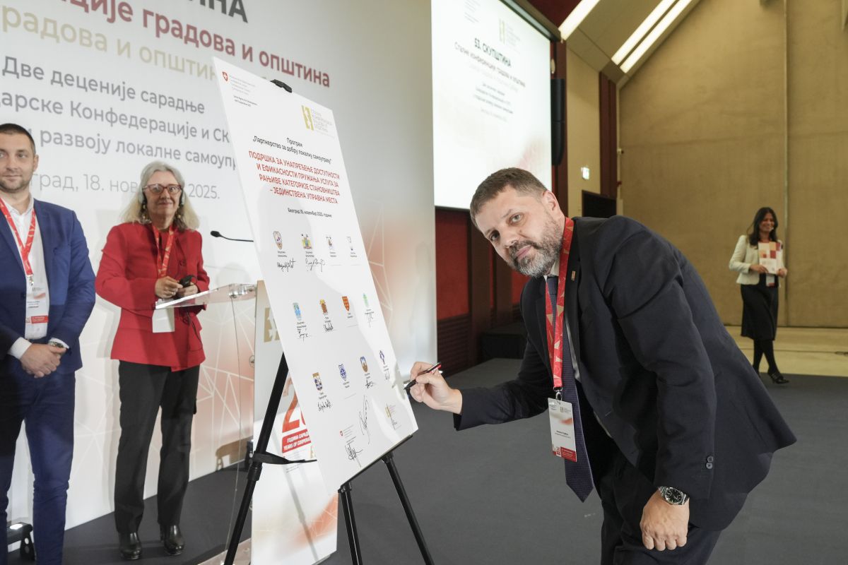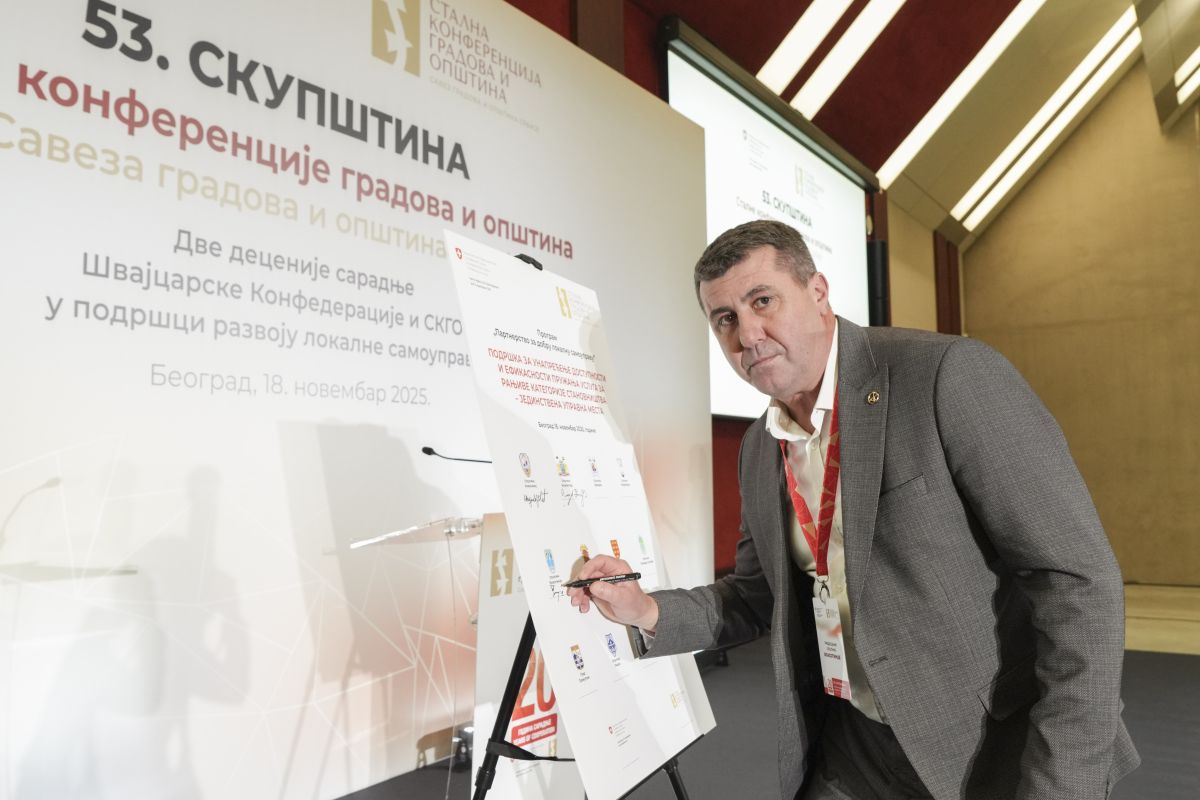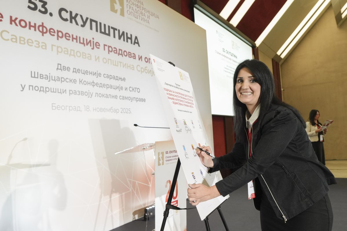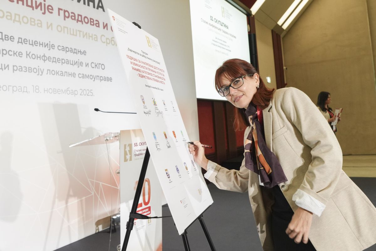 Tokom svečanog dela programa 53. skupštine Stalne konferencije gradova i opština (SKGO), održane 18. novembra 2025. godine u Beogradu, 15 lokalnih samouprava dobilo je zahvalnice za uspešno sprovođenje paketa podrške, dok su u okviru dva projekta sa 89 gradova i opština potpisani sporazumi o sprovođenju novog ciklusa podrške.