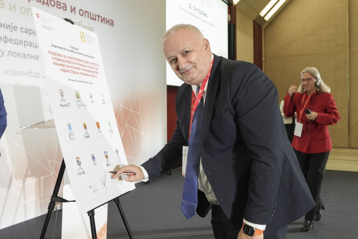 Na ceremoniji potpisivanja ispred nadležnih institucija učestvovali su An Lugon-Mulen, ambasadorka Švajcarske Konfederacije u Srbiji, Radovan Arežina, v.d. pomoćnika ministra državne uprave i lokalne samouprave i Nikola Tarbuk, generalni sekretar SKGO.