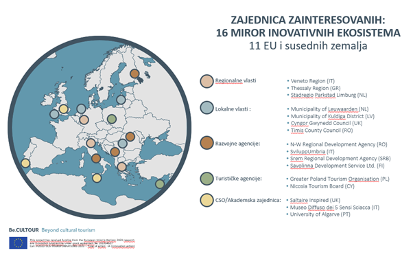 Međunarodna Zajednica zainteresovanih, tzv. inovativni “mirror” - ekosistem regioni čine institucije i organizacije iz cele Evrope, odabrane na međunarodnom konkursu sa preko 60 prijavljenih institucija i organizacija. Ova zajednica će biti aktivno uključena i pozvana da podeli primere svoje najbolje prakse učestvovanjem u projektnim aktivnostima zajedničkog stvaranja, uzajamnog učenja i izgradnje kapaciteta strastvenim ljudima iz prakse koji će biti zaduženi za oblikovanje sektora kulturnog turizma budućnosti. Uz uzajamno učenje, nadgradnju poslovnih rešenja i saradnju između pilot-regiona i mirror-ekosistema, obezbeđujući održivost rezultata Projekta i nakon što se on okonča, učestvuju: